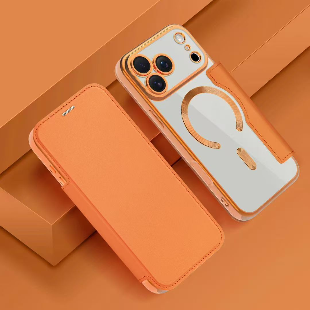 Suitable for Iphone17Pro Gold Shield Magnetic Leather Case Mobile Phone Case Apple 16E Flip Cover 15 Electroplating Anti-Fall Protection 14